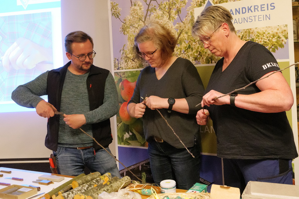 Auf dem Programm standen an Veredelungstechniken mit Weiden und Apfelreisern: Einfaches und Verbessertes Rindenpropfen, Wenksches Rindenpropfen, Tittelpfropfen und die Kopulation mit Gegenzunge.