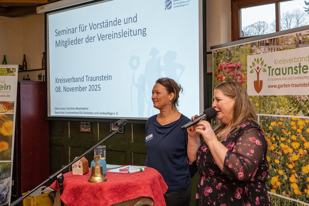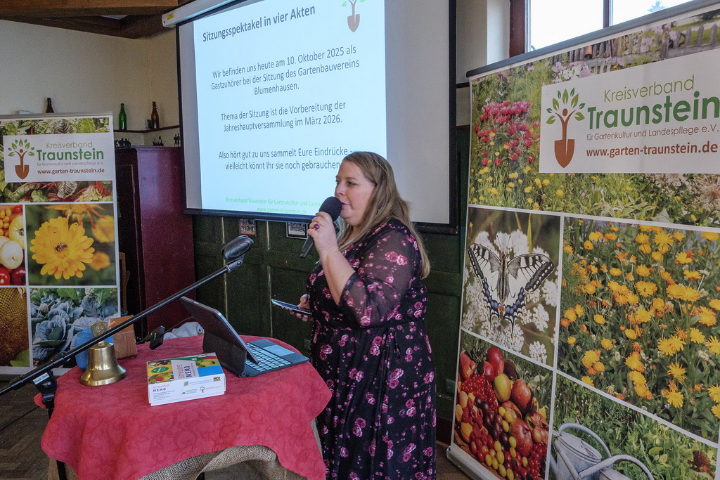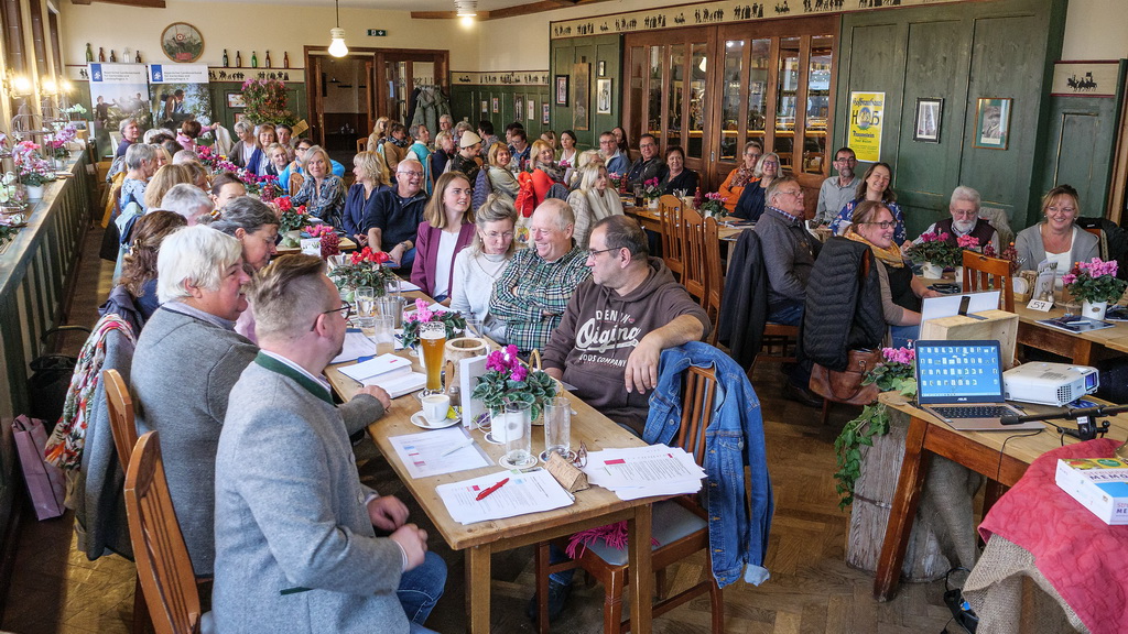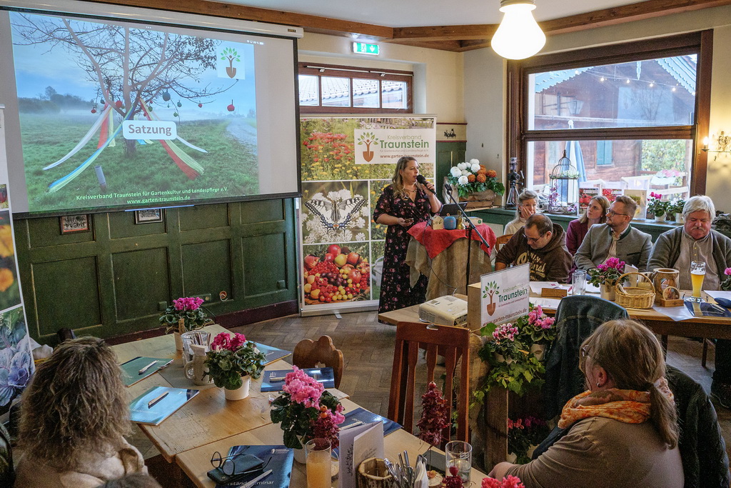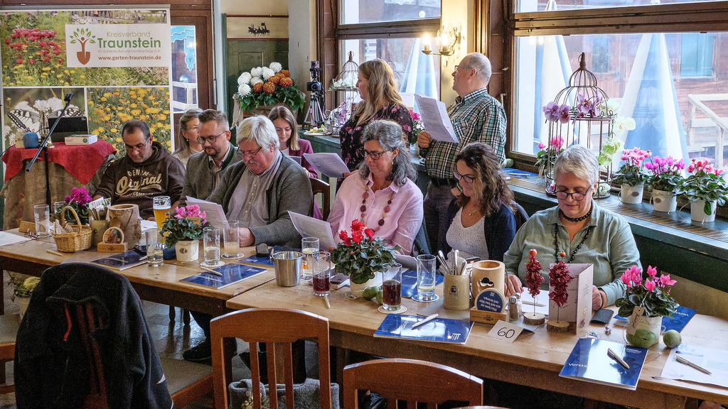 Zur Herbstarbeitstagung hatte der Kreisverband Traunstein für Gartenkultur und Landespflege e.V. gemeinsam mit dem Bayerischen Landesverband die Vorstände der 51 Obst- und Gartenbauvereine nach Traunstein geladen. „Erfolgreiche Vereinsarbeit geht leichter mit guter Unterstützung“, fasste Birgit Furtner das umfangreiche Programm zusammen. Und so startete die Tagung im voll besetzten Sailer Keller mit einem „Sitzungstheater in vier Akten“, das die Kreisvorstandschaft selbst geschrieben hatte und in dem sich alle Anwesenden leicht aus den eigenen Erfahrungen des Vereinslebens wiederfanden. Die gespielte Sitzung handelte von der Organisation einer Jahreshauptversammlung und brachte ganz nebenbei die wichtigen vereinsmäßigen Pflichten, die Hilfsmittel des Kreisverbandes, vielen Anregungen für eigene Vereinsthemen, den praktischen Checklisten für erfolgreiche Vereinsarbeit und vielem mehr zusammen. Die vier Akte waren je von vertieften Einheiten zu Inhalten der Satzung, zum korrekten Versammlungsablauf, dem Kassenbericht sowie würdevollen Ehrungen ergänzt. „Statt der wenig geliebten Gruppenarbeiten wollten wir heuer die inhaltlich wichtigen Themen mal anders verpacken“, schmunzelte Furtner. Und das gelang der Kreisvorstandschaft wie Applaus und Lacher zeigten.