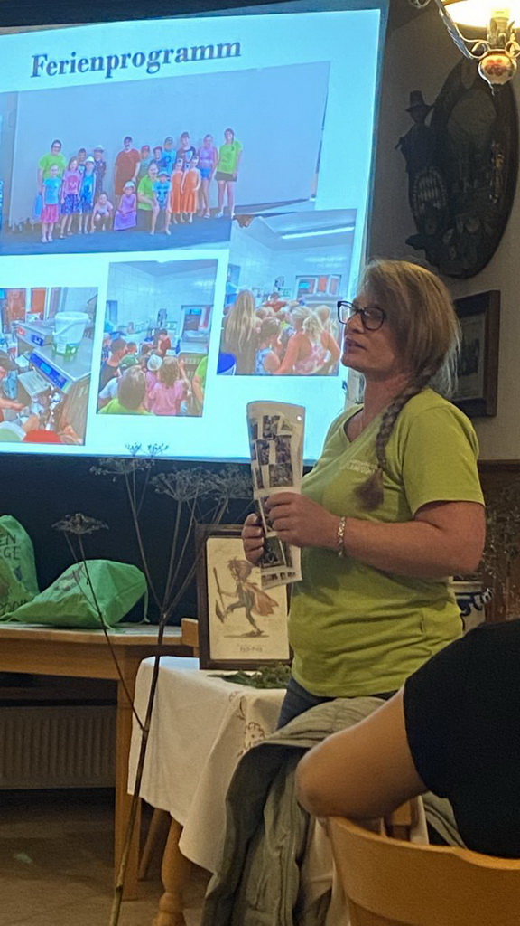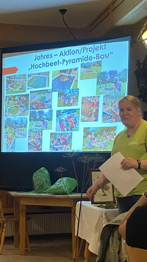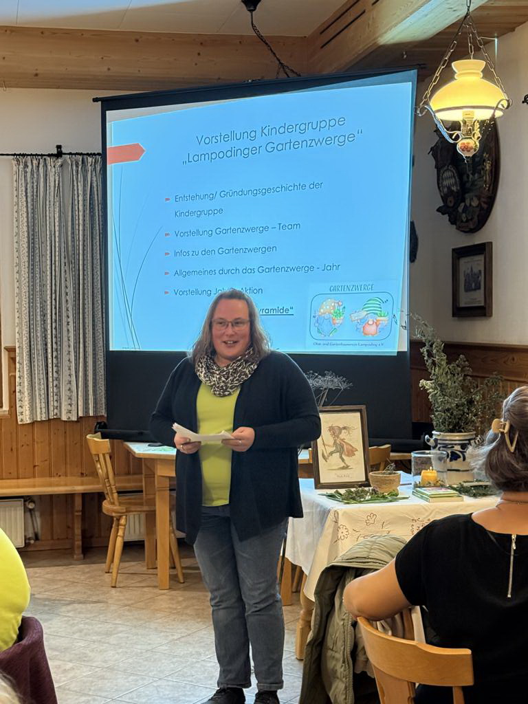 Als Gastgeber fungierte der Gartenbauverein Lampoding, dessen 6 Gruppenleiterinnen anwesend waren, um ihre Kindergruppe „Lampodinger Gartenzwerge“ vorzustellen. Derzeit werden 84 Kinder und Jugendliche von 5-18 Jahren betreut, von denen sich an den regelmäßigen Treffen immer 25-40 beteiligen. Mit vielfältigem Basteln, z.B. zum Mutter- und zum Vatertag, Spielen, Wandern und Forschen sind immer kleine Abenteuer geboten. Bemerkenswert ist auch der Bau, die Gestaltung und Bepflanzung eines Pyramidenhochbeets, von dem auch die Einwohner naschen dürfen und mit dem die Gartenzwerge im Ortskern von Lampoding präsent sind. Dass die Betreuung einer Kindergruppe viel Spaß macht, war den aktiven Gruppenleiterinnen anzusehen.
