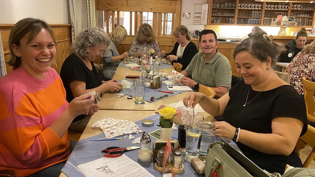In der Pause war Zeit, sich bei den vielen angebotenen Bastelideen der Lampodinger und am Büchertische weitere Inspiration zu holen. Danach konnte selbst Hand angelegt werden: Aus Gläsern und Flaschen entstanden mittels Serviettentechnik Vasen und Windlichter, ein Bastelvorschlag, der zu Hause leicht mit der eigenen Kindergruppe nachgemacht werden kann.