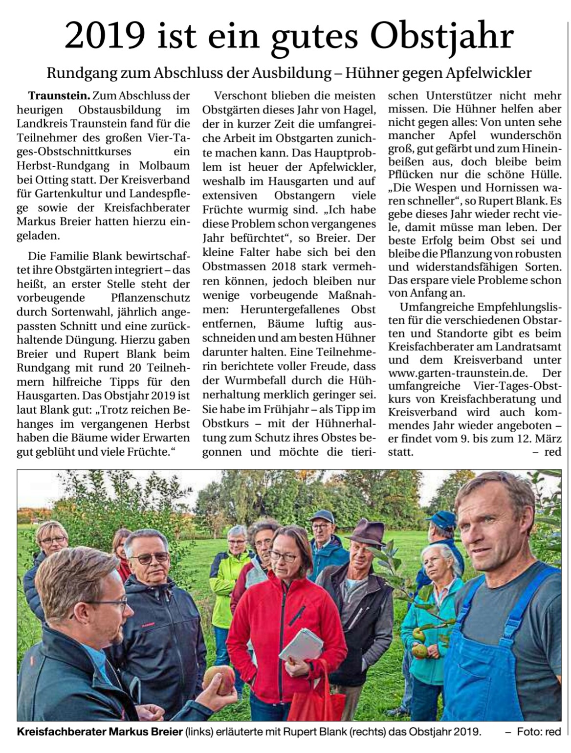 Zum Abschluss der heurigen Obstausbildung im Landkreis Traunstein fand für die Teilnehmer des großen 4-Tages-Schnittkurses ein Herbst-Rundgang in Molbaum statt. Kreisverband und Kreisfachberater hatten hierzu eingeladen.