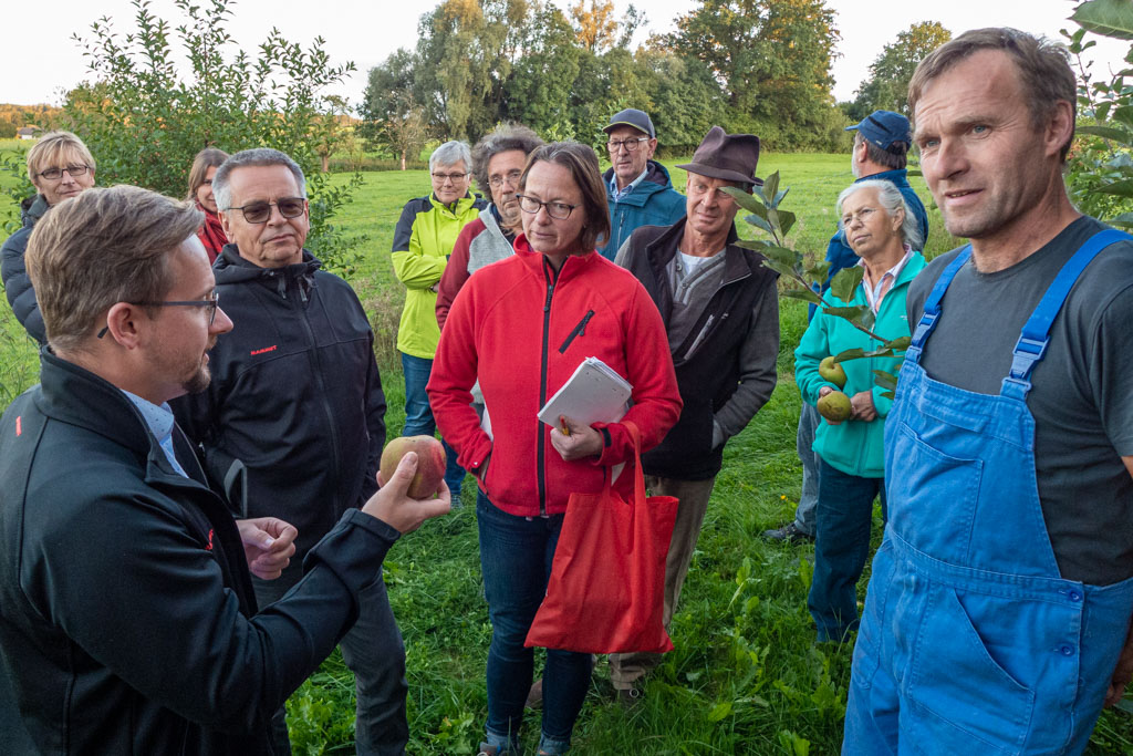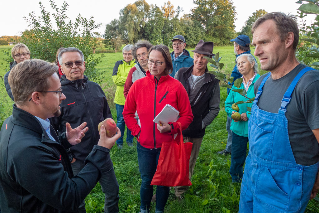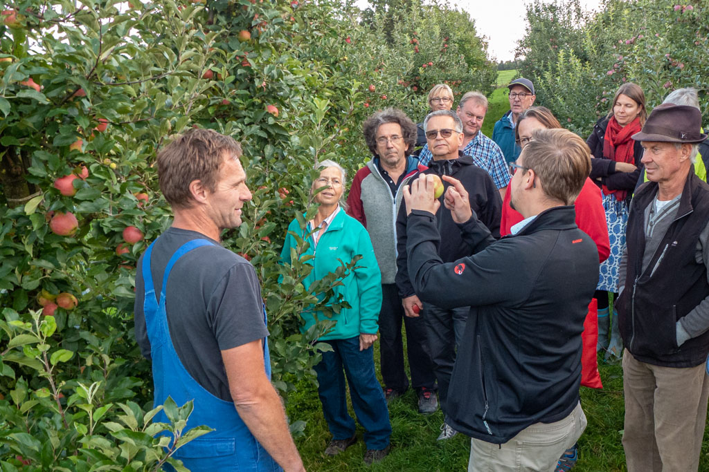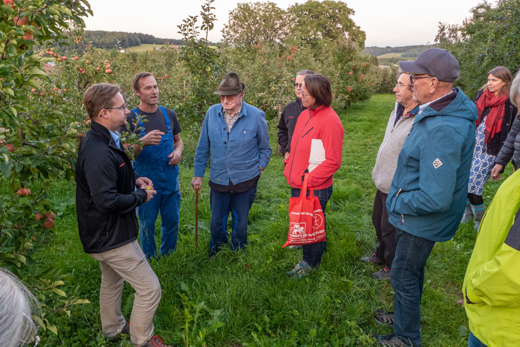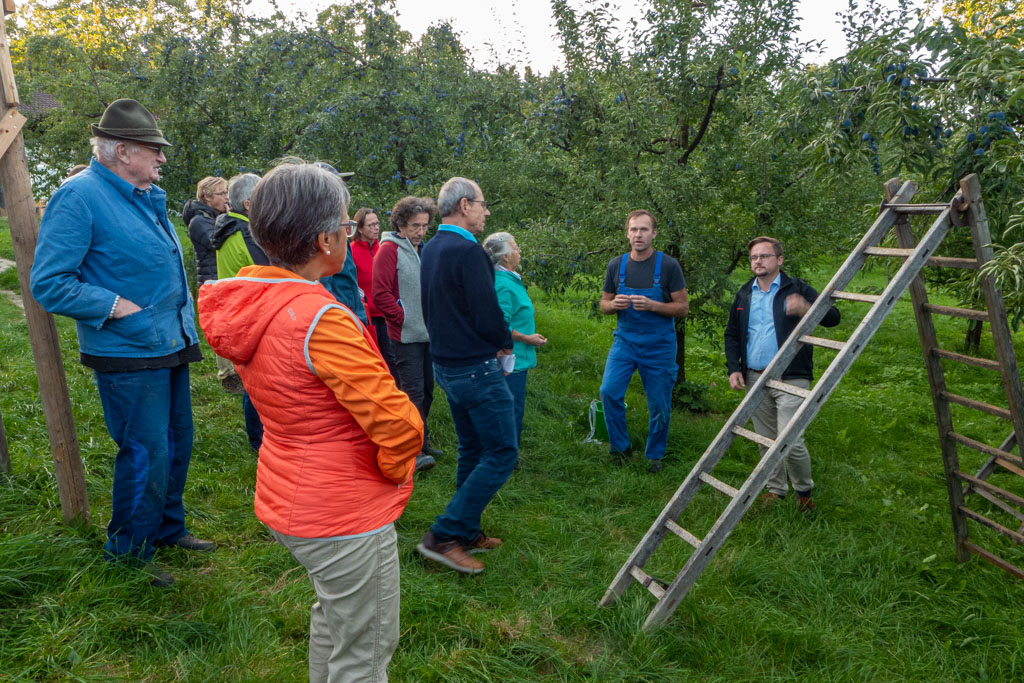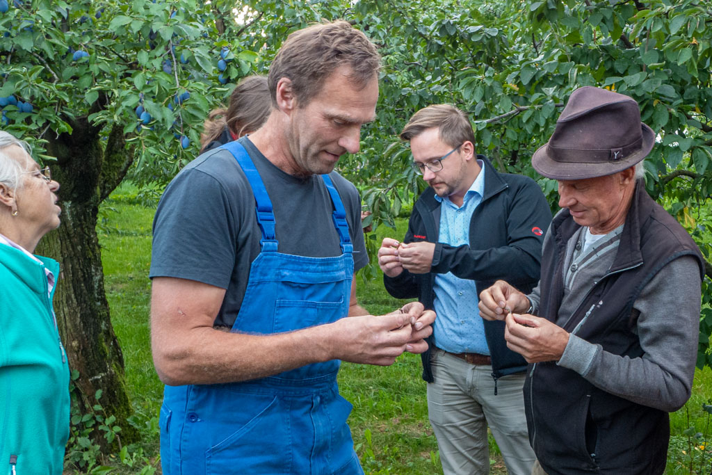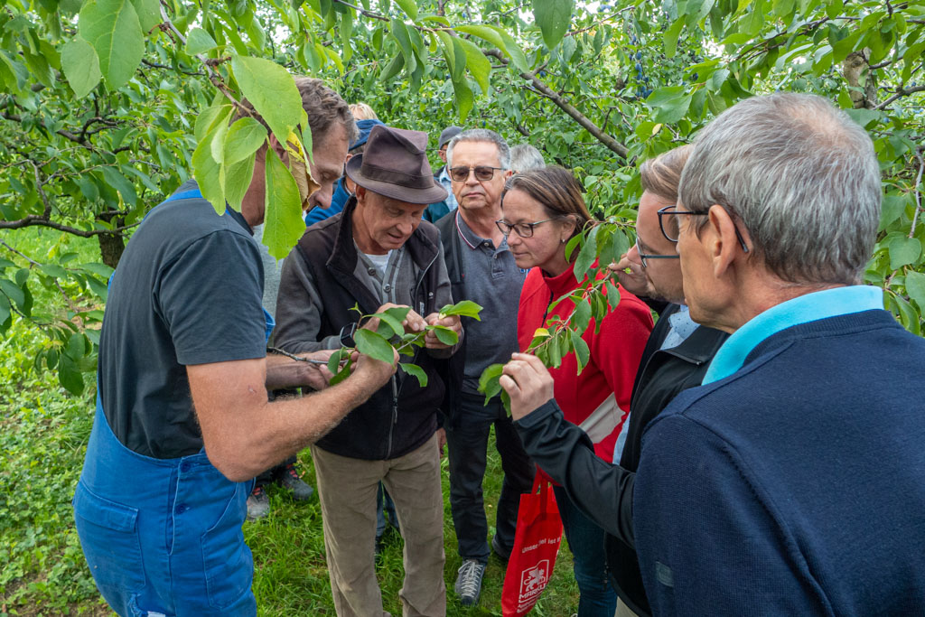 Familie Blank bewirtschaftet ihre Obstgärten integriert, das heißt, an erster Stelle steht der vorbeugende Pflanzenschutz durch Sortenwahl, jährlich angepasstem Schnitt und einer differenzierte Düngung. Hierzu gaben Rupert Blank und Kreisfachberater Markus Breier beim Rundgang mit rund 20 Teilnehmern hilfreiche Tipps für den Hausgarten.