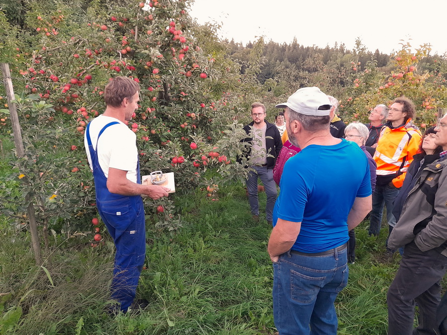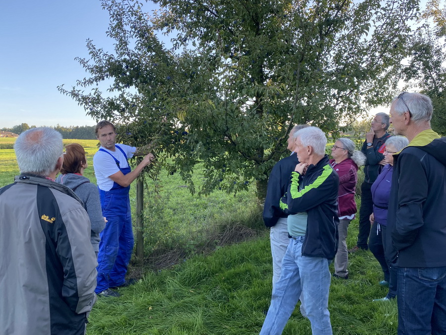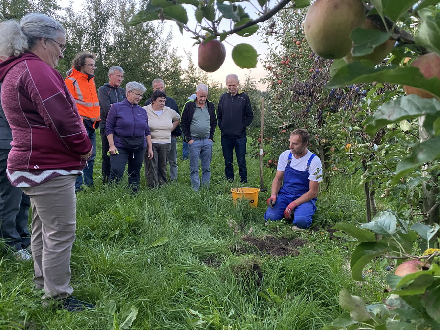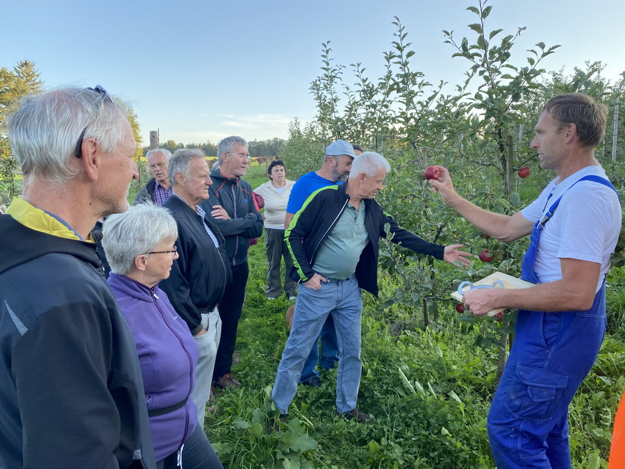 Traditionell schauen die TeilnehmerInnen des großen Obstschnittkurses vom Frühjahr nochmal beim Obsthof Blank im Molbaum bei Otting vorbei, um das Ergebnis von Schnitt und Pflege durchs Jahr zu sehen. Kreisfachberater Markus Breier und Rupert Blank führten durch den großen und sortenreichen Obstgarten.