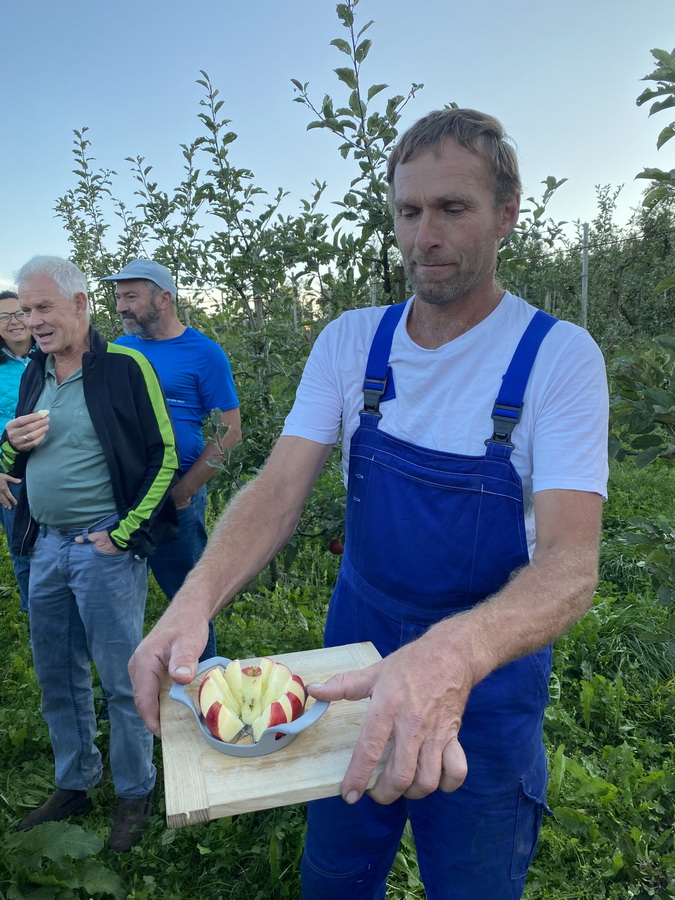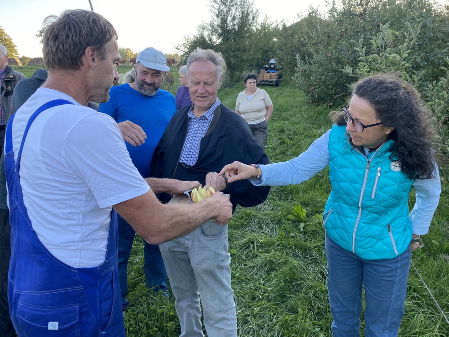 „Daheim gab es gar kein Obst“, so eine Teilnehmerin. Anders in Molbaum: wegen des leichten Nordosthangs und des damit späteren Austriebs, blieben viele Sorten vom schlechten Wetter während der Blütezeit verschont und trugen deshalb gut. Und so konnten die Teilnehmer/innen aus dem ganzen Landkreis nicht nur Äpfel und Zwetschgen bestaunen, sondern auch ganz frisch vom Baum verkosten. Egal ob Santana, Topaz, Rubinola, Gala, Rubinette oder Goldglanz – jede Sorte hat ihre Vorzüge und Herausforderungen. Auch der Geschmack ist höchst verschieden und so war für Jede und Jeden eine passende dabei.