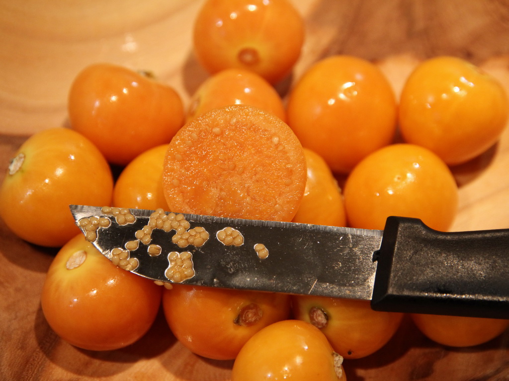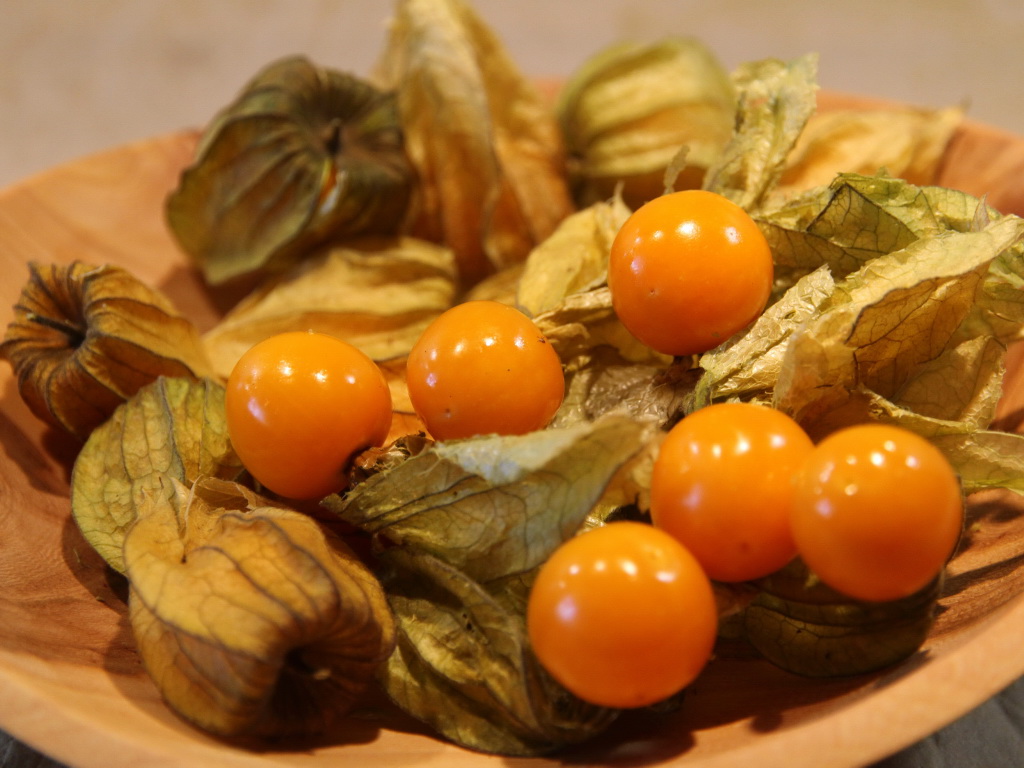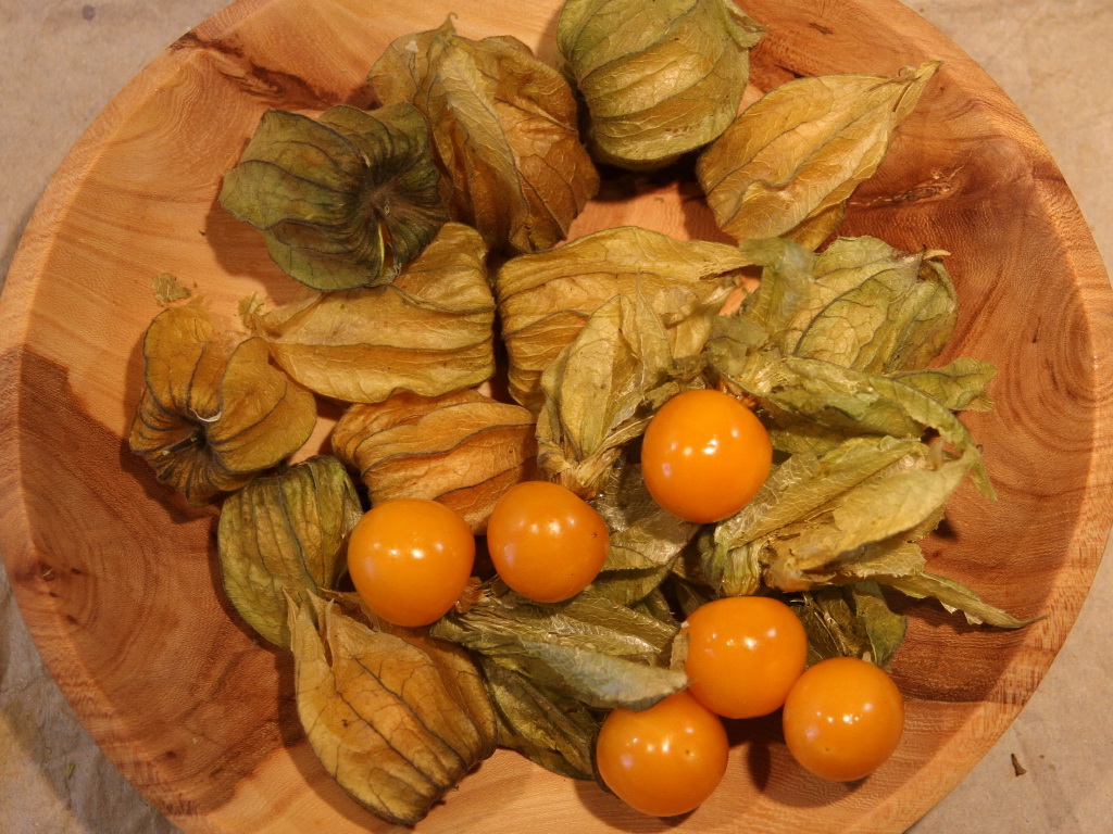 Reif sind die Früchte, wenn der grüne Kelch (Lampion) hellbraun und trocken wird. Die Beere ist dann gelblich. Bitte mit Lampion ernten, dann hält sich die Frucht einige Tage.